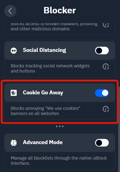 You can access this feature in the extension by entering the Blocker menu from the top-right corner of the main extension interface, and then scrolling down to find Cookie Go Away.